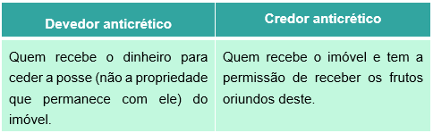 A anticrese consiste em um direito real de garantia que recai SEMPRE em um bem imóvel. Por meio dela o credor tem a permissão de receber os frutos oriundos deste imóvel e contabilizá-los no abatimento gradual da dívida.