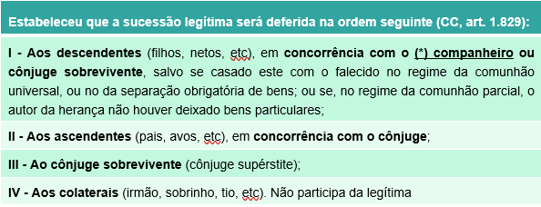 A sucessão legítima é aquela em que a lei determina quem irá suceder. Ocorrerá a sucessão legítima:
