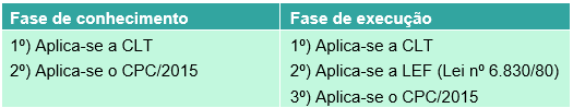 Notemos que há uma diferença, na fase de conhecimento, aplica-se nos casos omissos o CPC/2015 como norma subsidiaria, desde que essa seja compatível, já na fase de execução, no caso de omissão da CLT, aplica-se a Lei de Execução Fiscal (Lei nº 6.830/80) e, subsidiariamente, o CPC/2015. Para facilitar vamos montar um quadro: